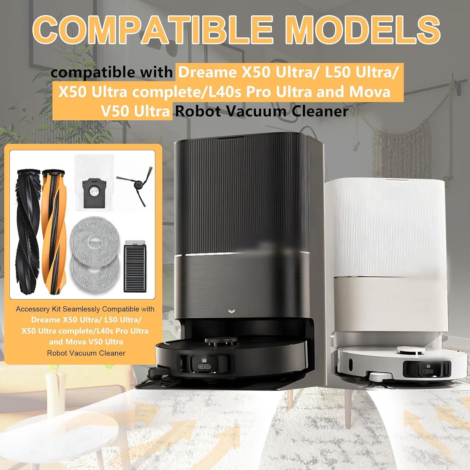 - [Product Compatibility]:Accessory Kit Compatible with Dreame X50 Ultra/ L50 Ultra/ L40s Pro Ultra and Mova V50 Ultra Robotic Vacuum Cleaners, please confirm your robot model before purchase.