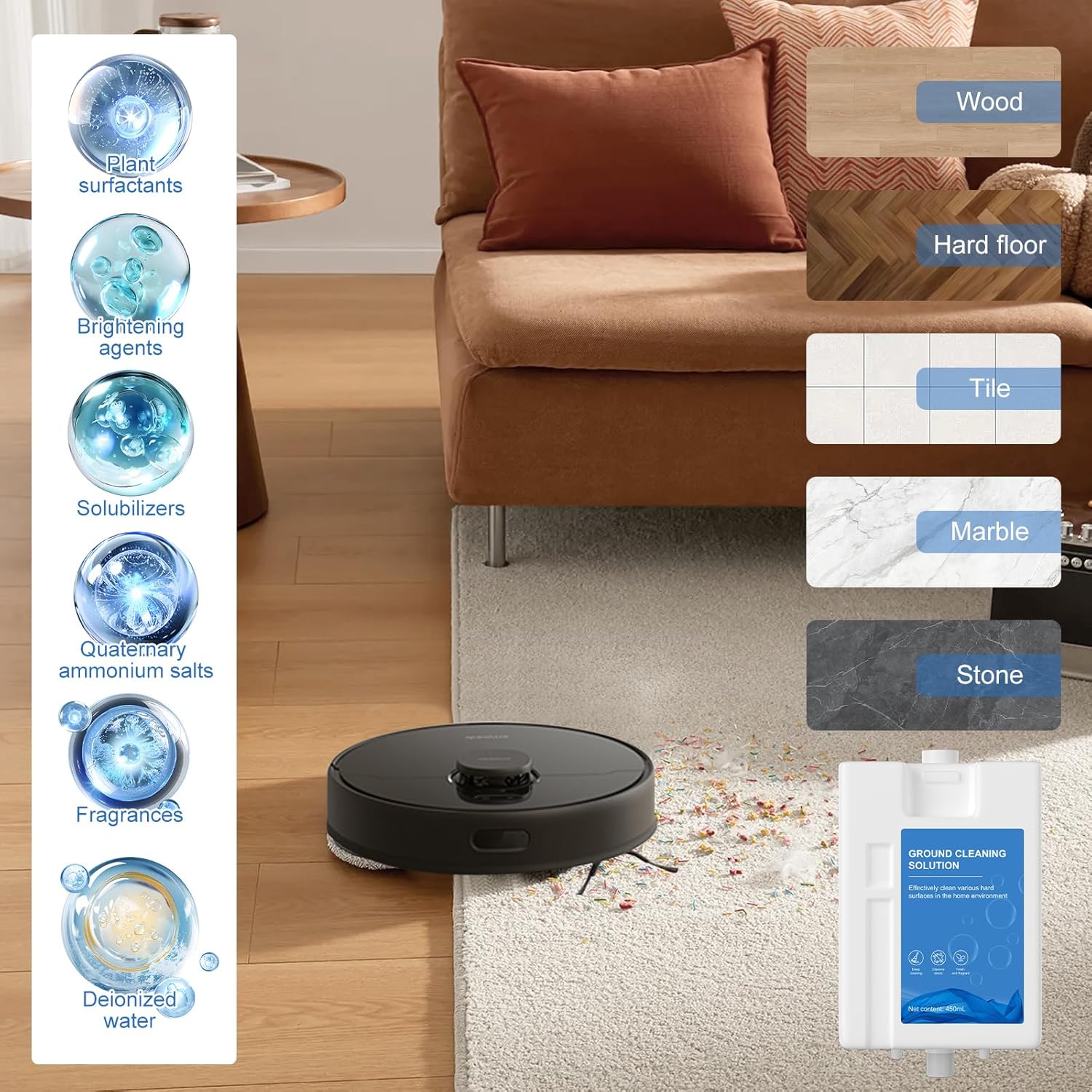 - 【L20 Ultra】 The floor cleaning solution designed specifically for L20 Ultra ensures effective mopping, leaving your floor radiant.
