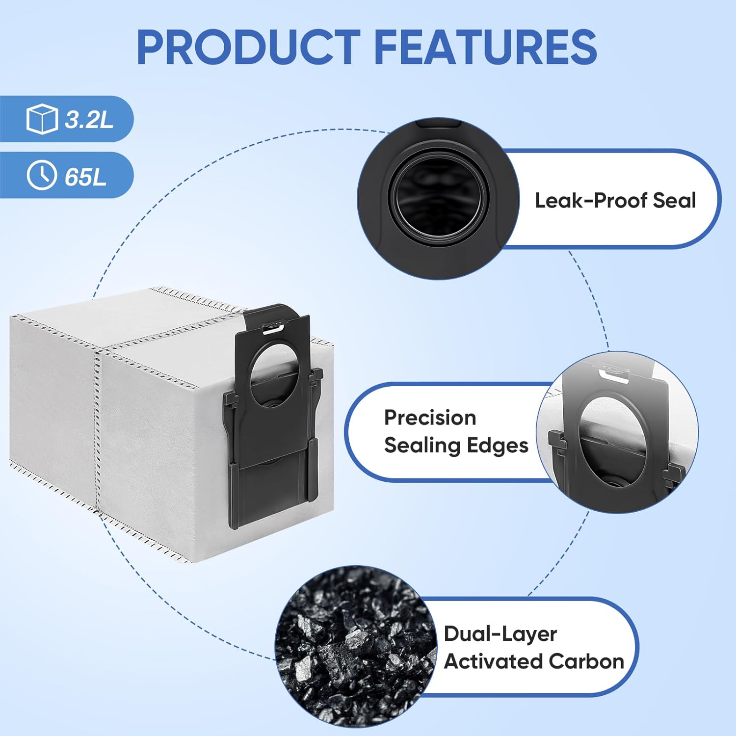 15-Pack Vacuum Bags for Dreame: 15-pack premium dust bags typically last 24+ months. Each high-capacity bag holds 3.2L of dirt, debris, and hair - ideal for pet households. Save up to 80% compared to buying single packs annually