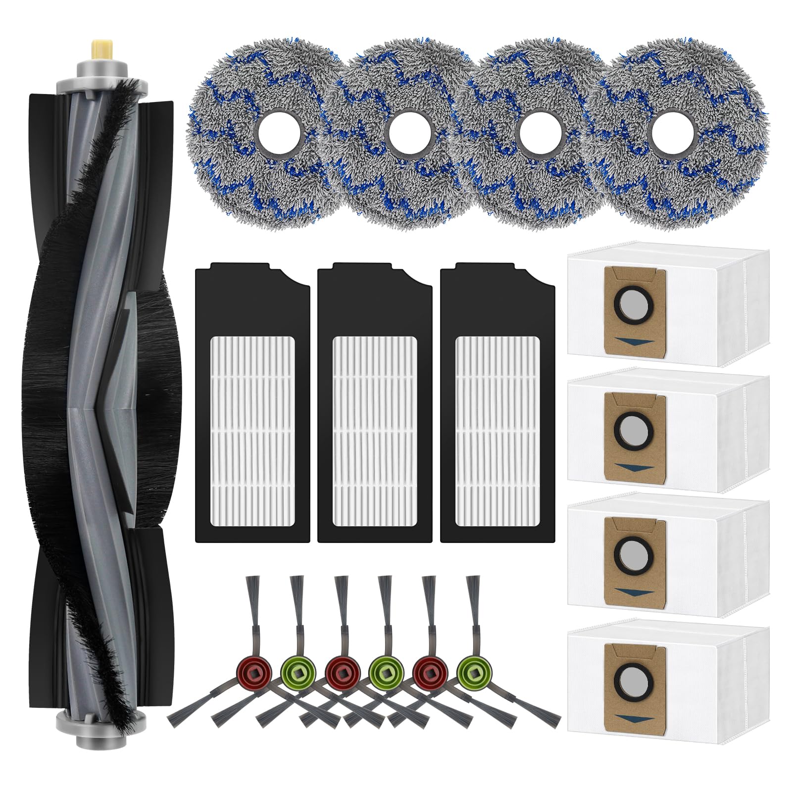 - Package Contents: 1 Roller brush 3 Filters 6 Side brushes 4 Mop cloth 4 Dust bag