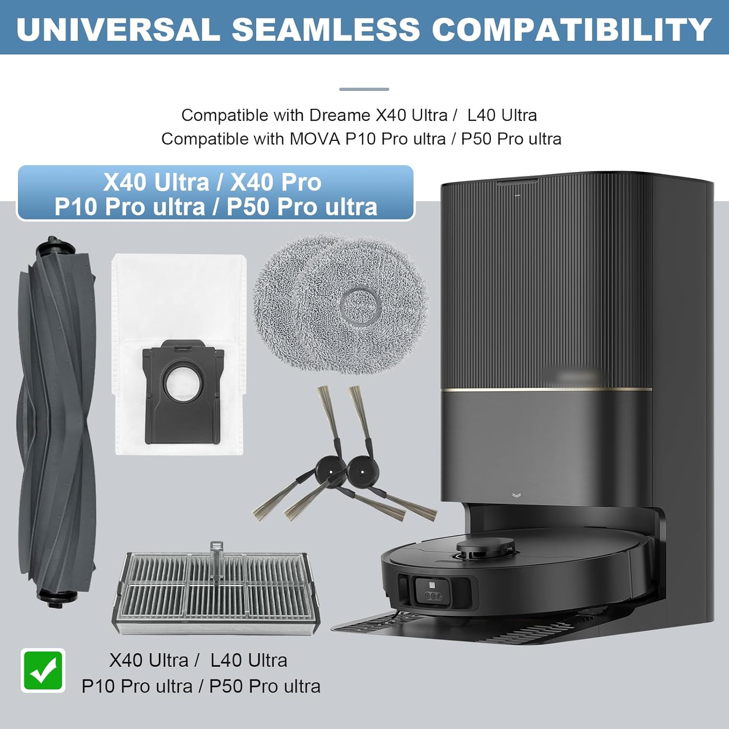 - [Product Compatibility]:Accessory Kit Compatible with Dreame X40 Ultra L40 Ultra MOVA P10 Pro/ P50 Pro ultra Robotic Vacuum Cleaners, please confirm your robot model before purchase.