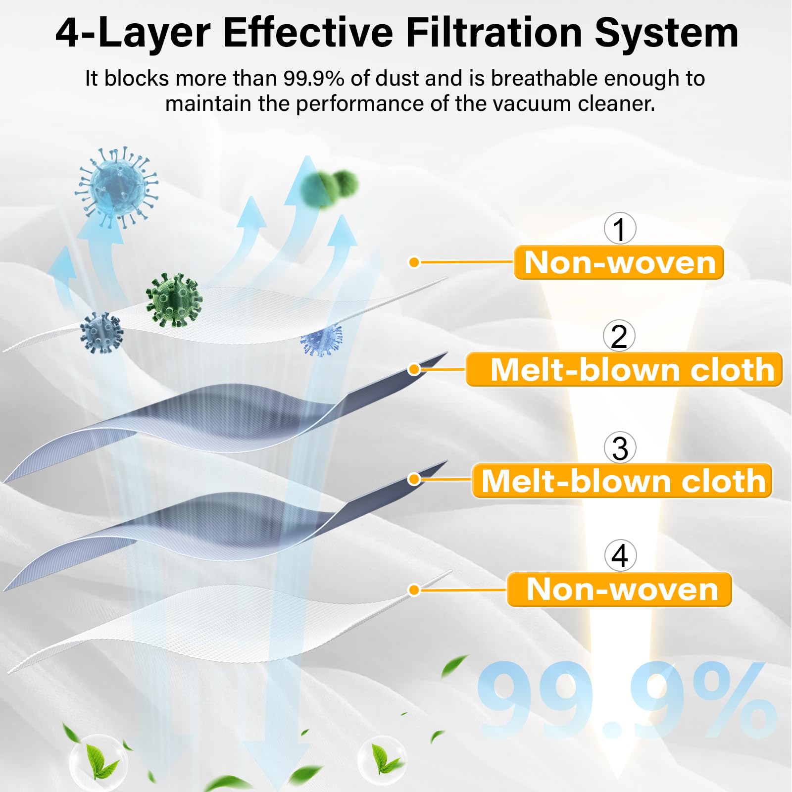 - Superior Standard: The non-woven fabric and melt-blown fabric self-sealed bags provide reliable cleaning.
