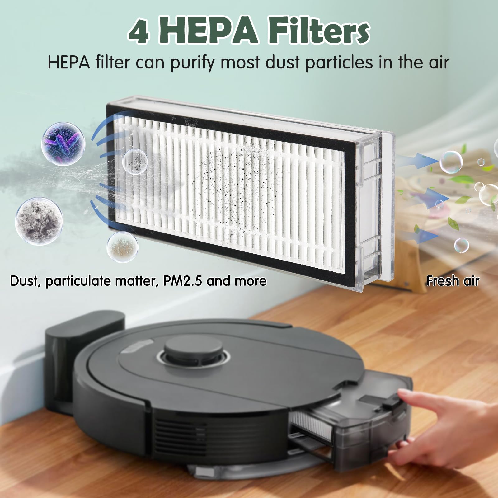 • GREAT VALUE PACKAGE: 1 Dual Rubber Main Brush, 4 Mop Cloth Pads, 6 Side Brushes (Black), 4 Washable Filters, 1 Cleaning Brush, 1 Screwdriver. The products are made of high-strength materials to ensure optimal performance and a healthier lifestyle.